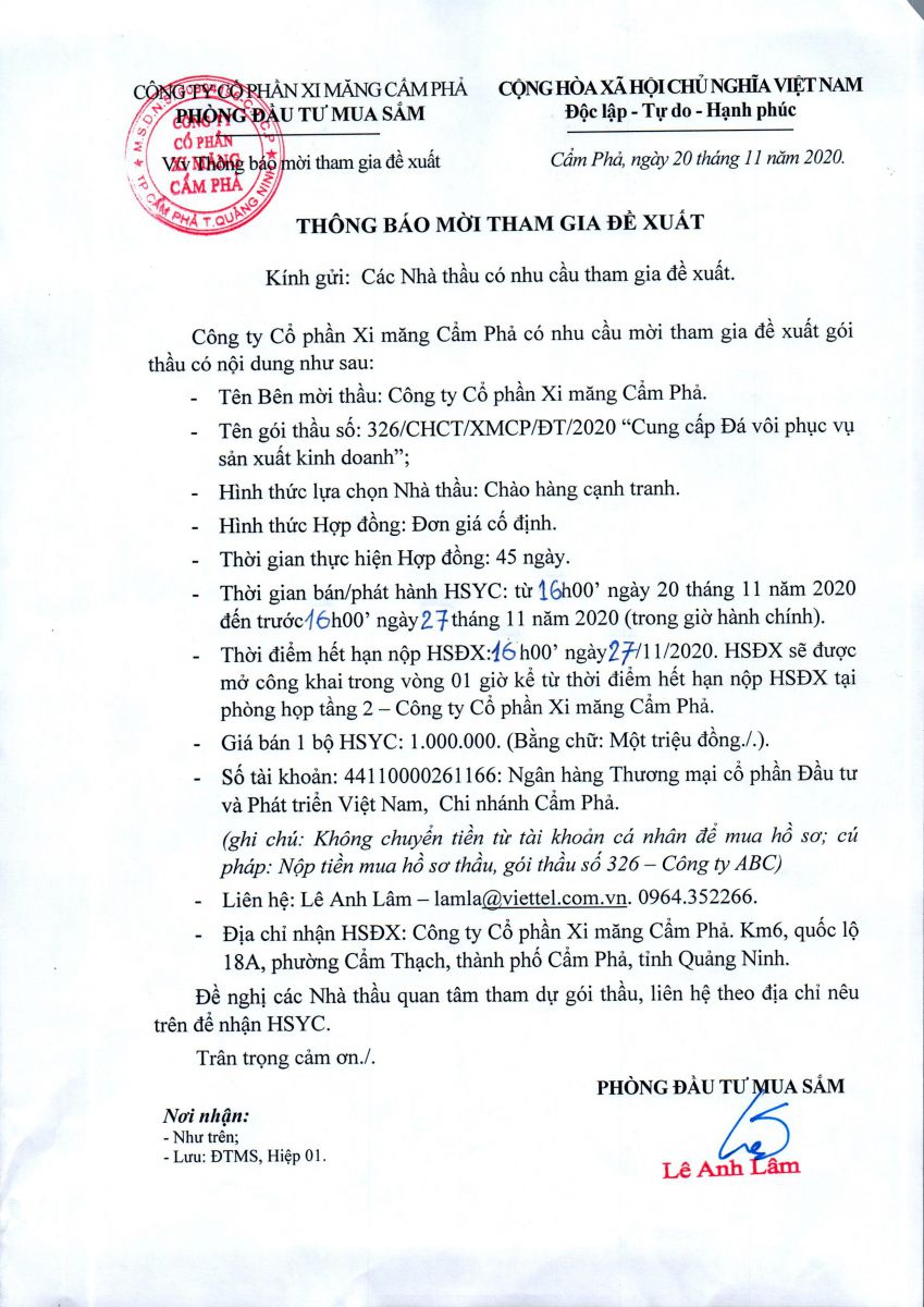 Thông báo mời tham gia đề xuất cung cấp đá vôi phục vụ sản xuất kinh doanh