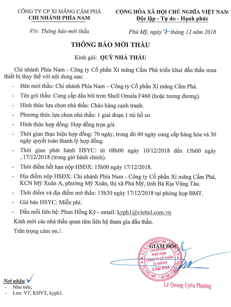 Thông báo mời tham gia đề xuất cung cấp dầu bôi trơn Shell Omala F460 hoặc tương đương