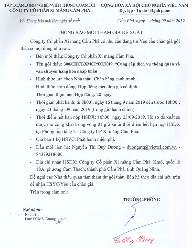 Thông báo mời tham gia đề xuất Cung cấp dịch vụ thông quan và vận chuyển hàng hóa nhập khẩu