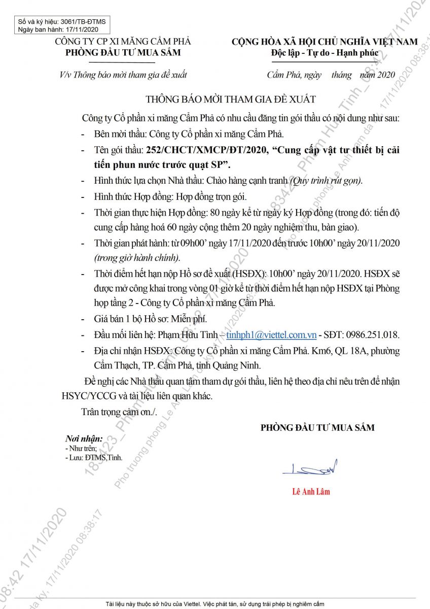 Thông báo mời tham gia đề xuất cung cấp vật tư thiết bị cải tiến phun nước trước quạt SP