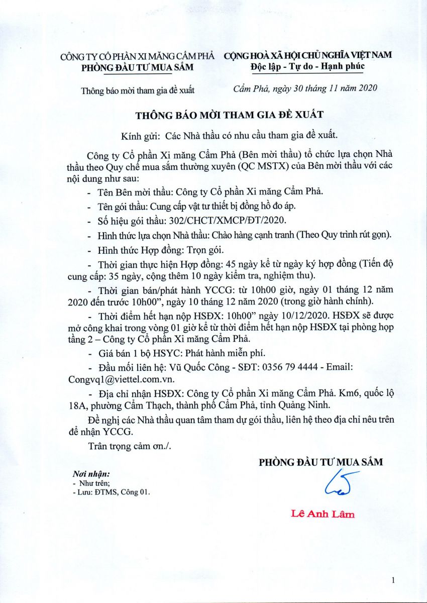 Thông báo mời tham gia đề xuất cung cấp vật tư thiết bị đồng hồ đo áp