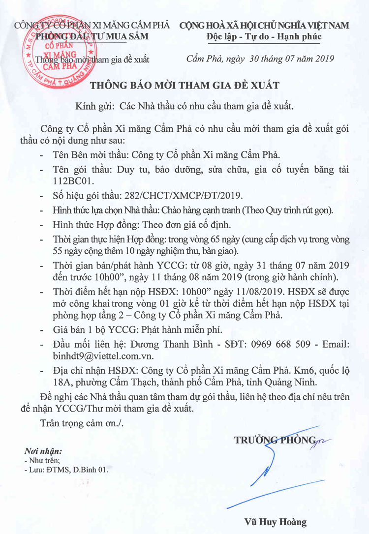 Thông báo mời tham gia đề xuất gói thầu Duy tu bảo dưỡng, sửa chữa gia cố tuyến băng tải 112BC01