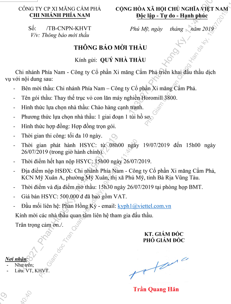 Thông báo mời tham gia đề xuất thay thế trục vỏ con lăn máy nghiền Horomill 3800