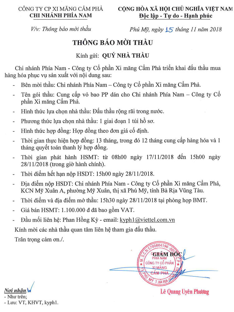 Thông báo mời tham gia đề xuất cung cấp vỏ bao PP dán cho Chi nhánh Phía Nam