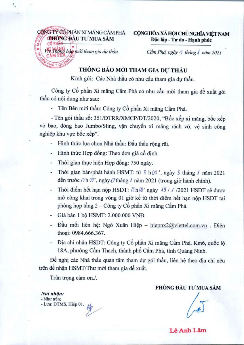 Thông báo mời tham gia đề xuất bốc xếp xi măng, bốc xếp vỏ bao, đóng bao Jumbo/Sling, vận chuyển xi măng rách vỡ, vệ sinh công nghiệp khu vực bốc xếp