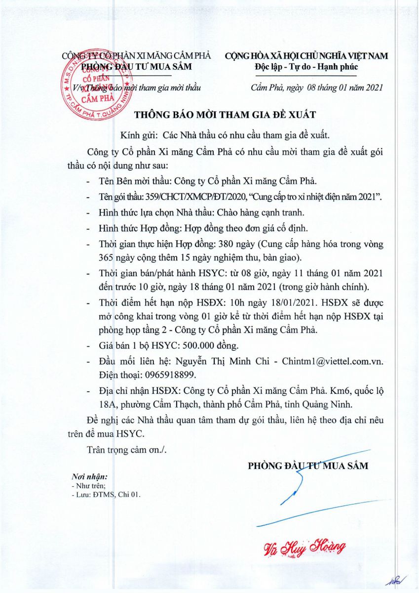 Thông báo mời tham gia đề xuất cung cấp xỉ nhiệt điện năm 2021